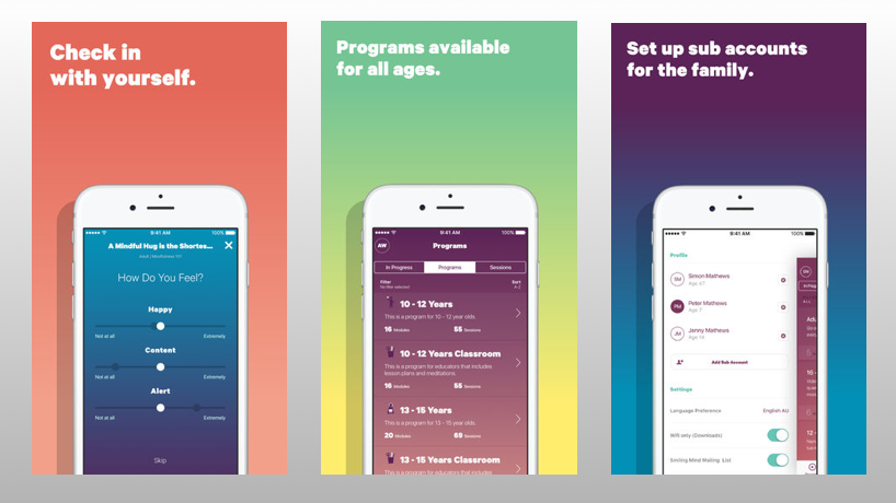 Smiling Mind is a free web and app-based program developed by psychologists and educators to help bring balance to people's lives. It is a 100% not-for-profit organisation that works to make mindfulness meditation accessible to all. Just as you eat well and stay fit to keep your body healthy, mindfulness meditation is about mental health and looking after the mind. Programs are designed to assist people in dealing with the pressure, stress and challenges of daily life. There are programs suitable for a variety of age groups.